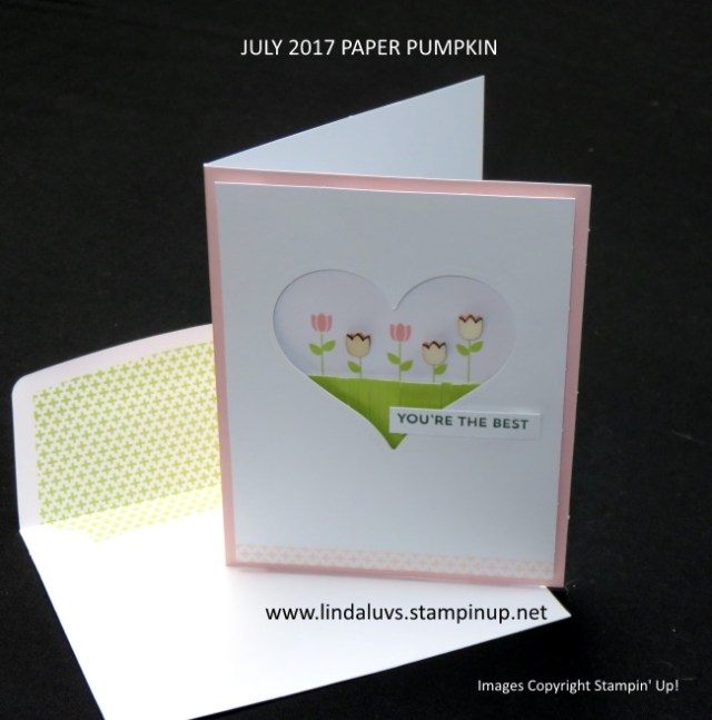 Here is the 3rd of the 4 card designs in the kit. It’s actually quite “Springy” Love the little tulips and how they are nestled into the heart like a little puppet show! The tulips are pre-printed so no worry about stamping solid images or “straight”! Even the grass was pre-cut for us! Wonder if they do lawns? lol