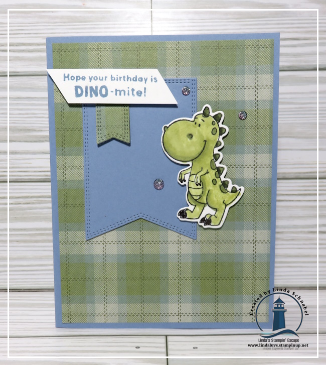 The second card is all about fun and energy—a birthday card featuring the “You’re Dino-Mite” sentiment! This playful design is sure to bring a smile to anyone’s face, whether it’s for a child or someone young at heart. The bold, cheerful imagery paired with vibrant colors of the Timeless Plaid Designer paper makes this card a true celebration. The Darling Dinos bundle is perfect for crafting birthday cards that stand out and feel personal for your loved ones.