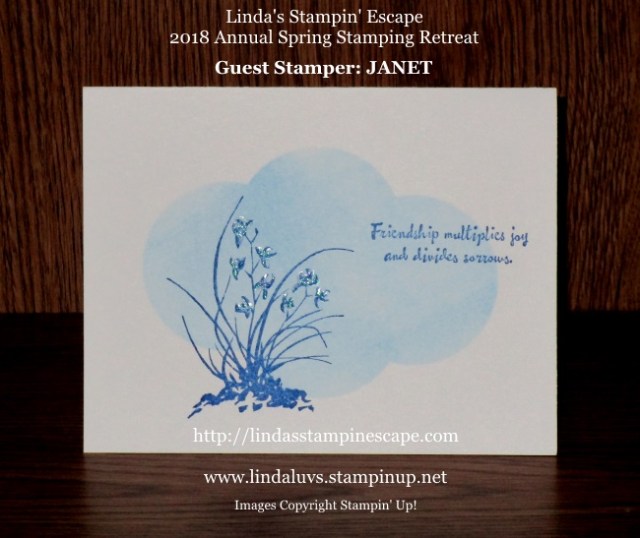 First is a simple yet beautiful card created using the reverse masking technique! My guest stamper is Janet. She used a reverse mask to add color to the card front and then stamped the floral image and greeting.