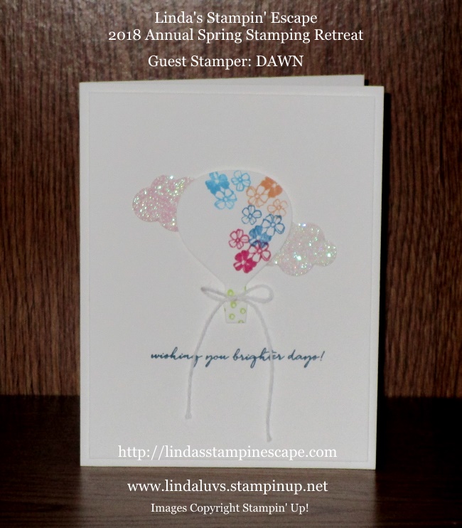 Our second card comes from a new attendee this year … Guest Stamper: Dawn. A little more layering on this card but the simplicity really creates a beautiful focal point… the balloon.