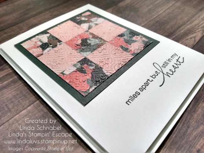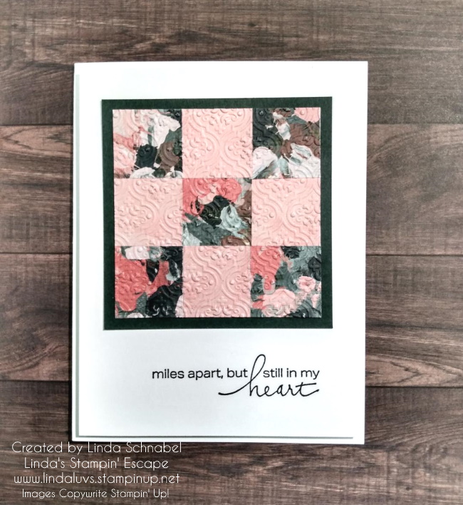 Once the adhesive was dry, I embossed it with the Quatrefoil Tile embossing folder. I like the added texture embossing brings to the pattern and to the card itself. This was adhered directly onto a piece of 3-1/4″ x 3-1/4″ piece of Evening Evergreen… this is my “edging” to my quilt.