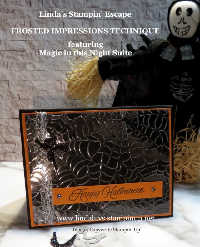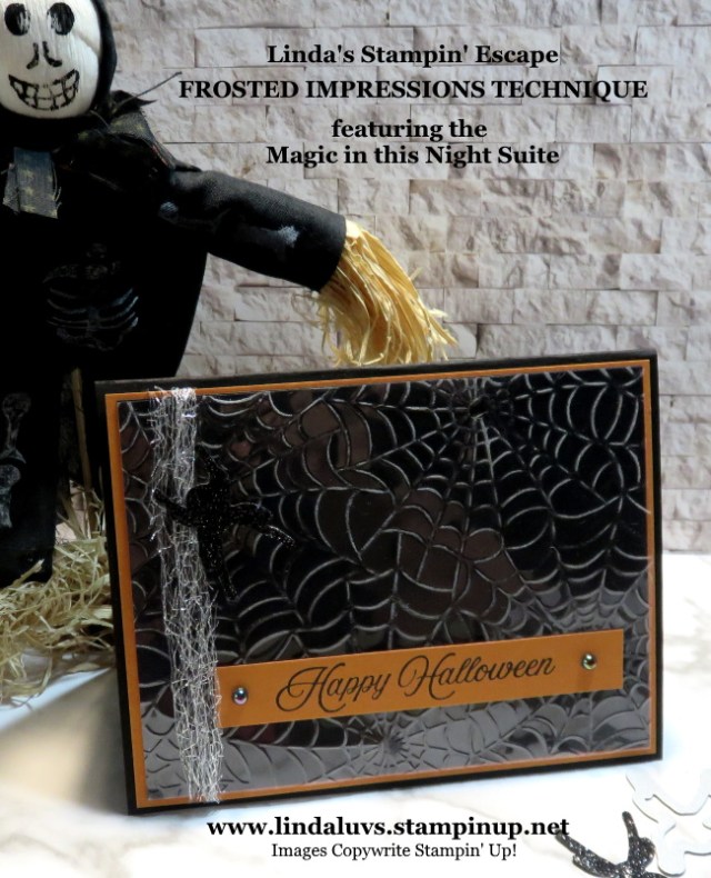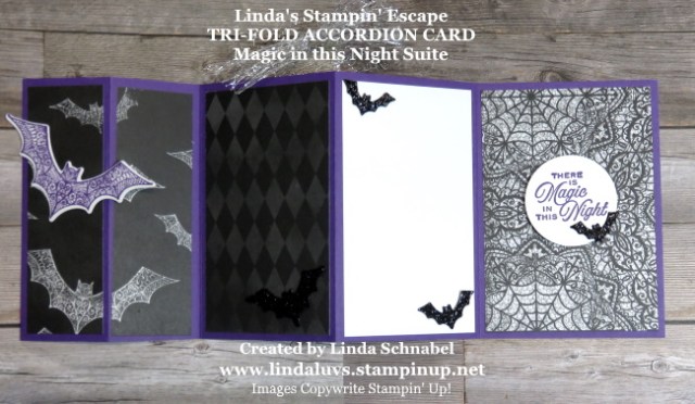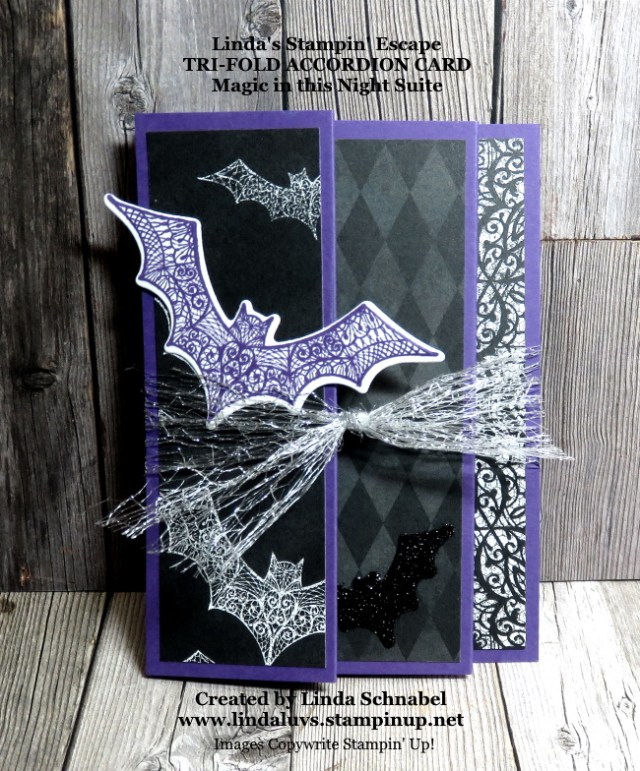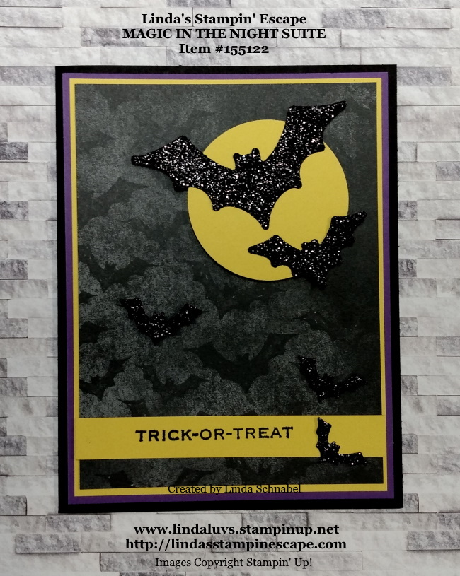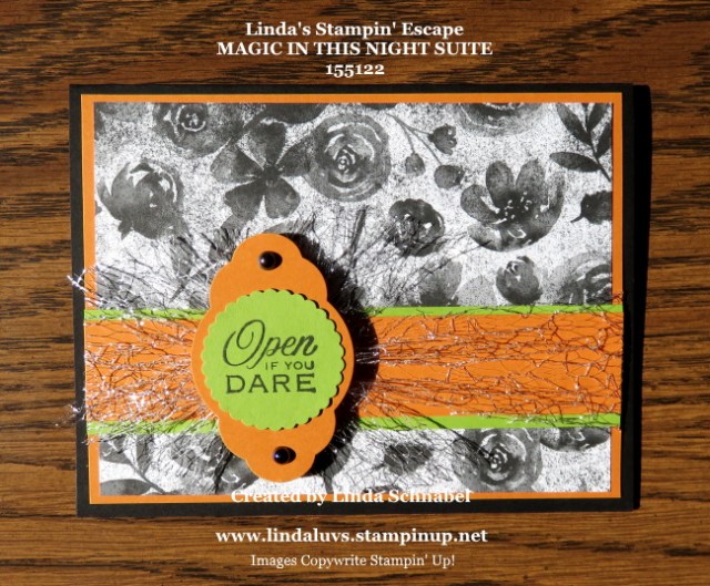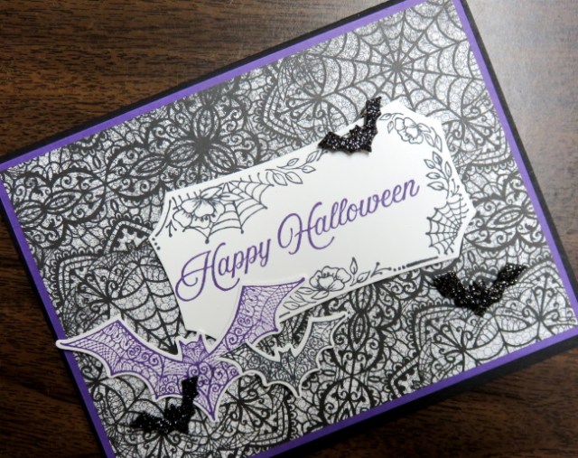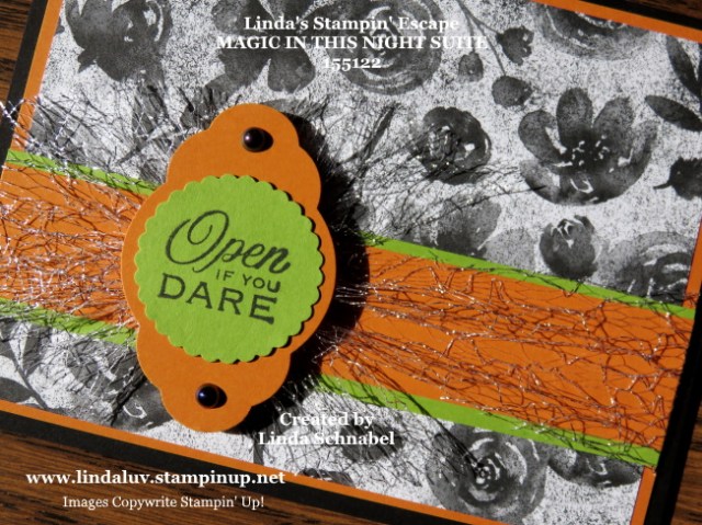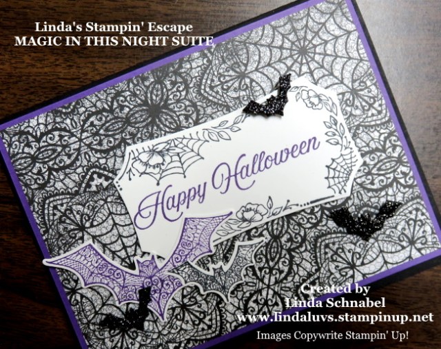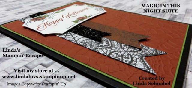 I like all 5 of the cards I’m sharing with you today, however I think this one is my favorite … it’s kind of sexy for a Halloween card! I share the tips on creating this card – just CLICK HERE to view. I love this pattern in the Magic in the Night Designer paper, I believe it would be beautiful on other holidays as well as Halloween.