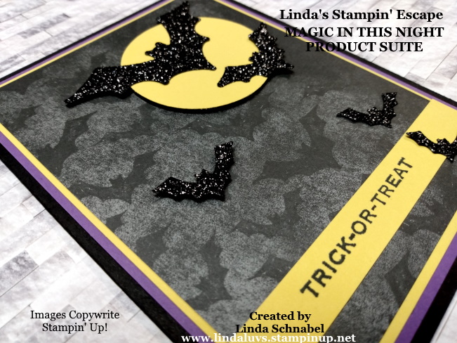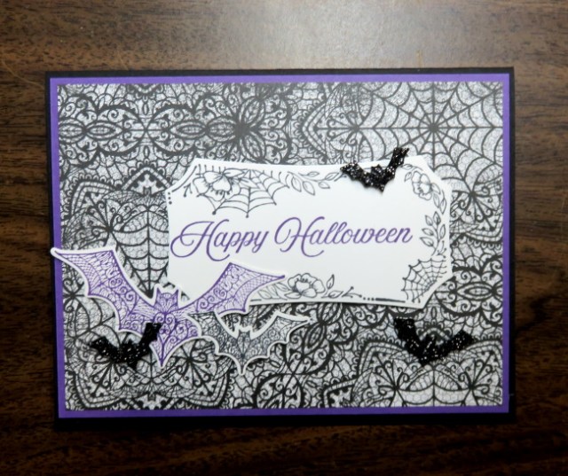 In Basic Black and Gorgeous Grape added to the stunning designer paper, this Halloween card has gone Gothic with a flair! You can read how this card was HERE … just click that link. The patterned bats are beautiful and I added a few “glitter” bats to enhance it further.