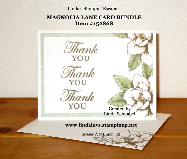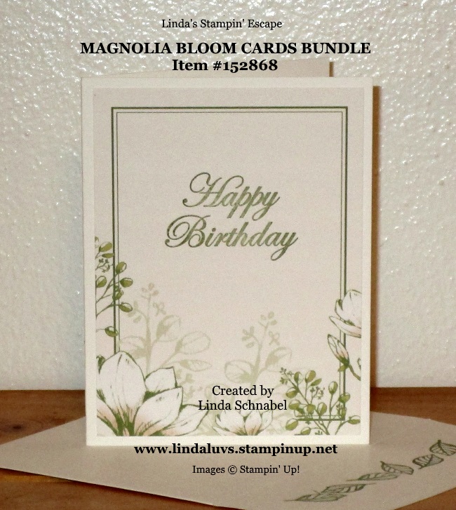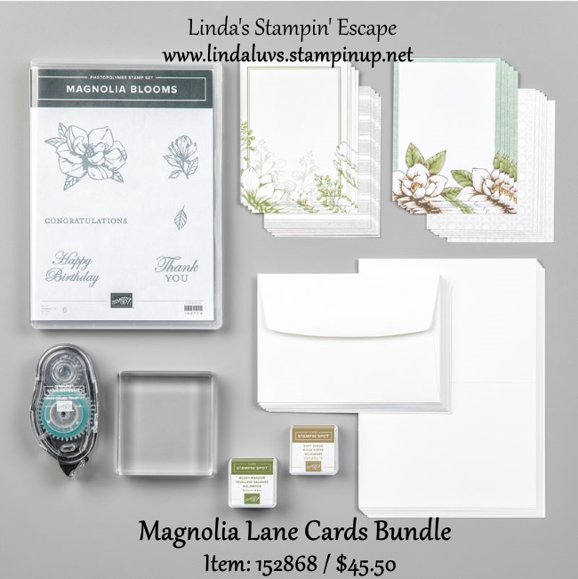 Today I want to share with you a great new bundle: the Magnolia Blooms Cards bundle … this can be found on pages 8 and 9 of the Experience Creativity Brochure (I will have them available in my upcoming classes/events) but you don’t have to wait for that to order it.