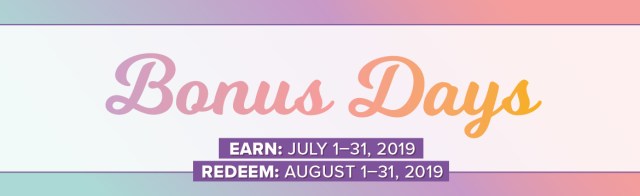 For each $50 you spend before July 31 (before shipping and tax) you’ll earn a $5 Bonus Days coupon code that can be used August 1–31. Don”t forget that with your $50 purchase … you will also earn a Virtual rewards point from me!! If your unfamiliar with my rewards CLICK HERE for Details 🙂