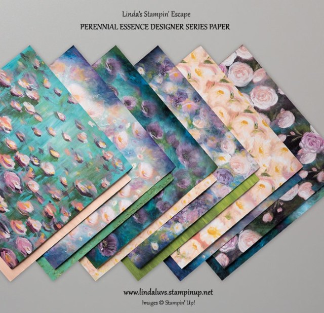 Our vellum is then layered over the stunning Perennial Essence Designer Series Paper which features hand-painted impressionistic imagery in rich colors. I use this designer paper often when I have to make a quick card, because it is so pretty … all you need is a greeting.