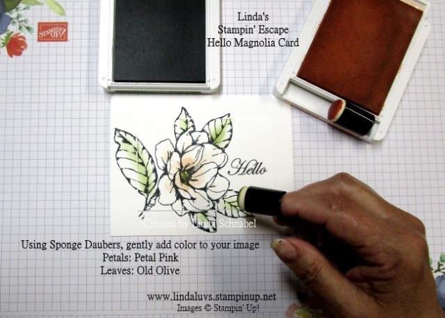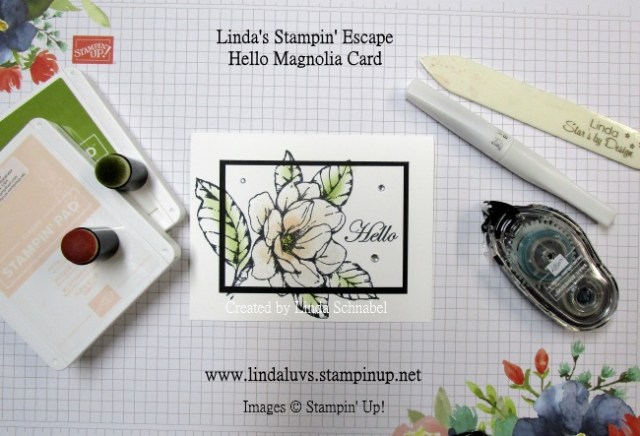This card truly highlights the folder as it is the entire background which adds elegance and a subtle texture and dimension to the card. The flower comes from a companion stamp set; Magnolia Blooms and does not come in the suite of Magnolia products, but coordinates beautifully. A greeting from the suite, a punch and a little ribbon and your card is complete!