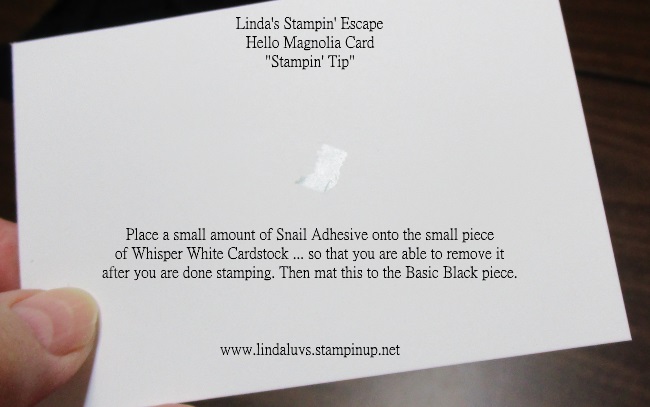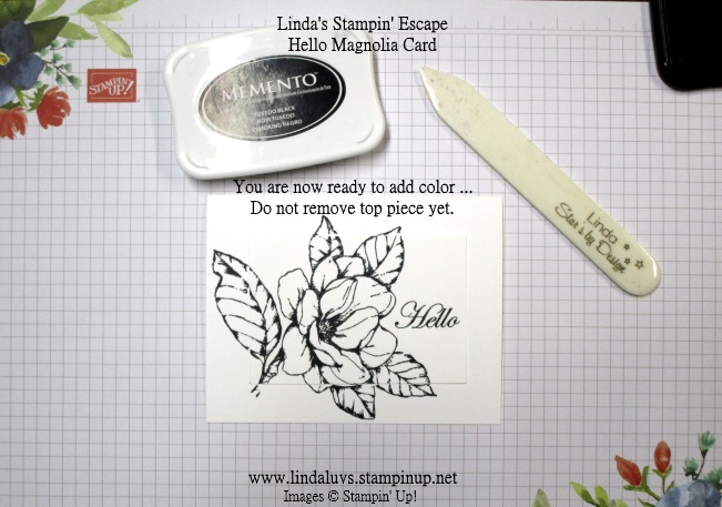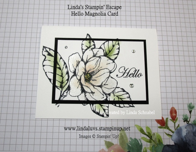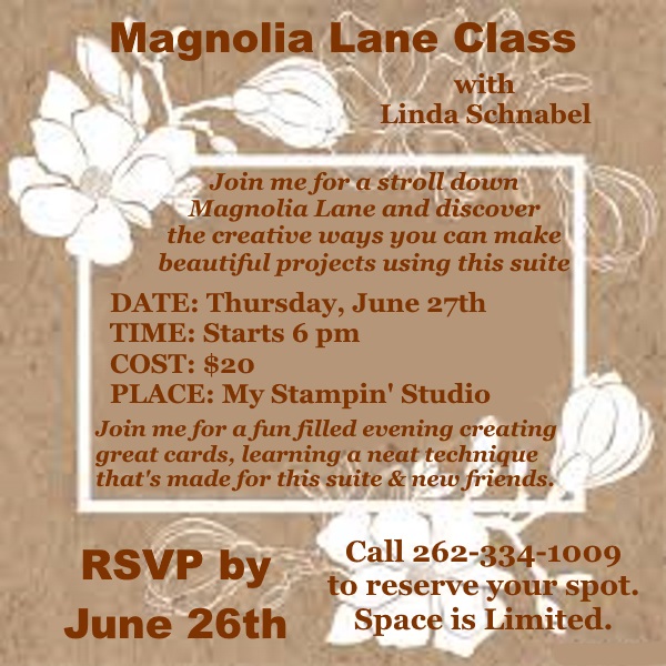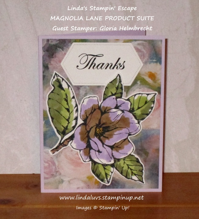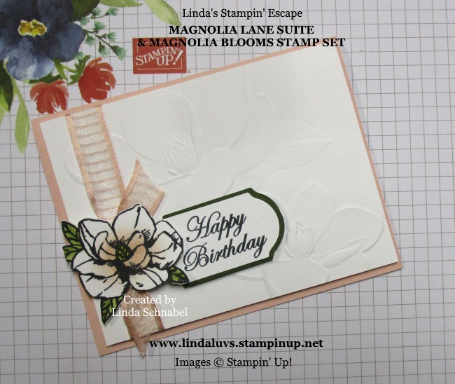 This card truly highlights the folder as it is the entire background which adds elegance and a subtle texture and dimension to the card. The flower comes from a companion stamp set; Magnolia Blooms and does not come in the suite of Magnolia products, but coordinates beautifully. A greeting from the suite, a punch and a little ribbon and your card is complete!
