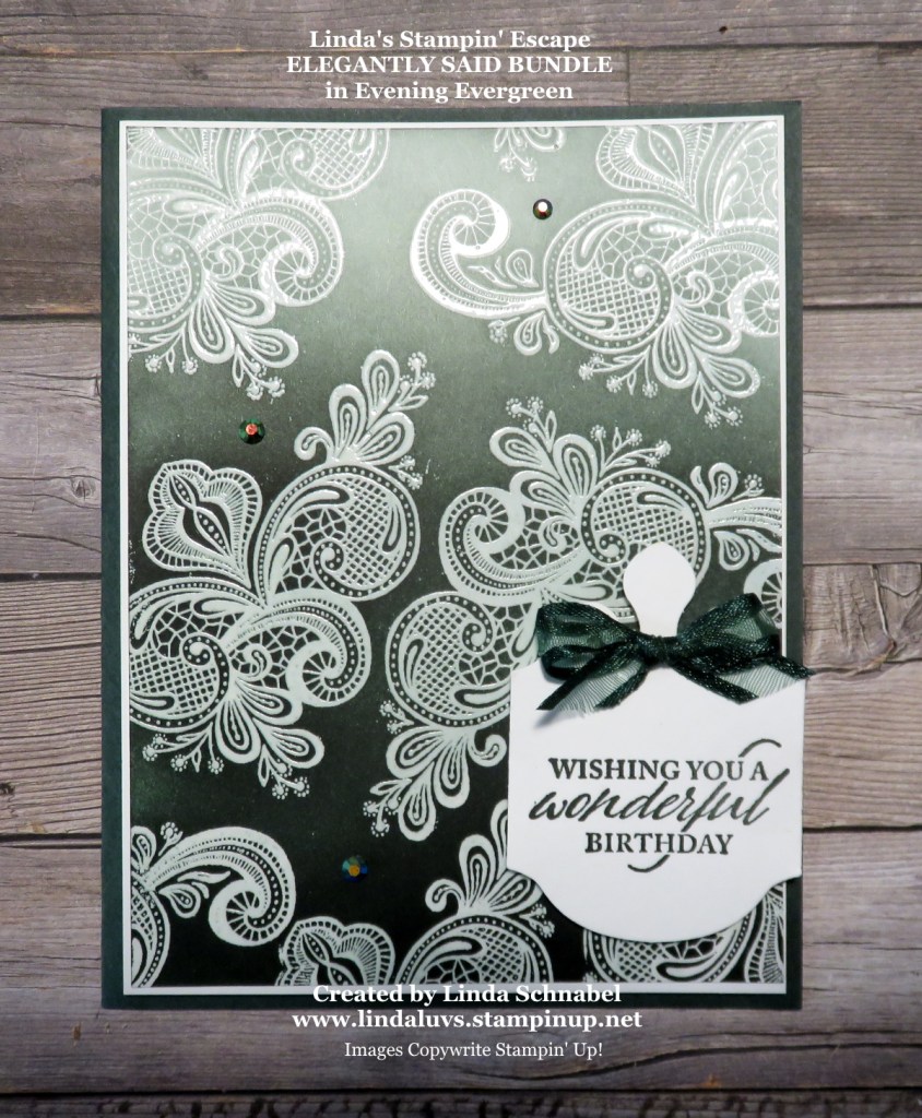 I used the Create with Friends stamp set and stamped my greeting in Evening Evergreen … I adorned the card with the 2021-23 In-Color Gems, also the Evening Evergreen.