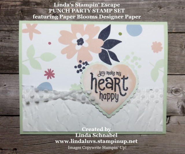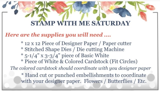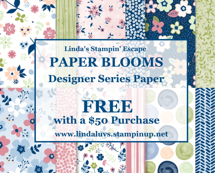 NOW … I’d like to invite YOU to join me for a fun Stamp Class … It’s STAMP WITH ME Saturday!! Tomorrow at 10: 30 am, meet me on my Linda’s Stamp’ Escape Facebook page; I’ll be LIVE and looking to stamp with you!! I’m going through step by step how to make another FUN FOLD Card and it “features” designer paper! There is NO Cost, I just want to gather with you and stamp!