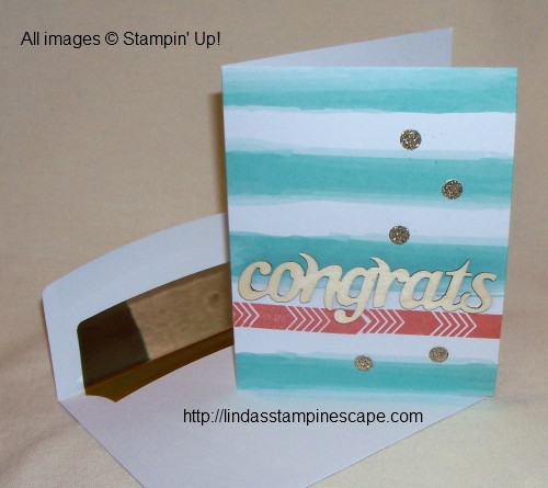 Here is my first sample, which represents how Stampin’ Up! pictures the design for you. You will see as we go on, that there are 4 each of the two different greetings in wood, the base cards, two different stamps, and two different ink colors. The cute little glitter dots, envelopes and gold envelope liners are also included in the kit. Oh yes, and they even have “glue dots” included to adhere your wooden greetings!