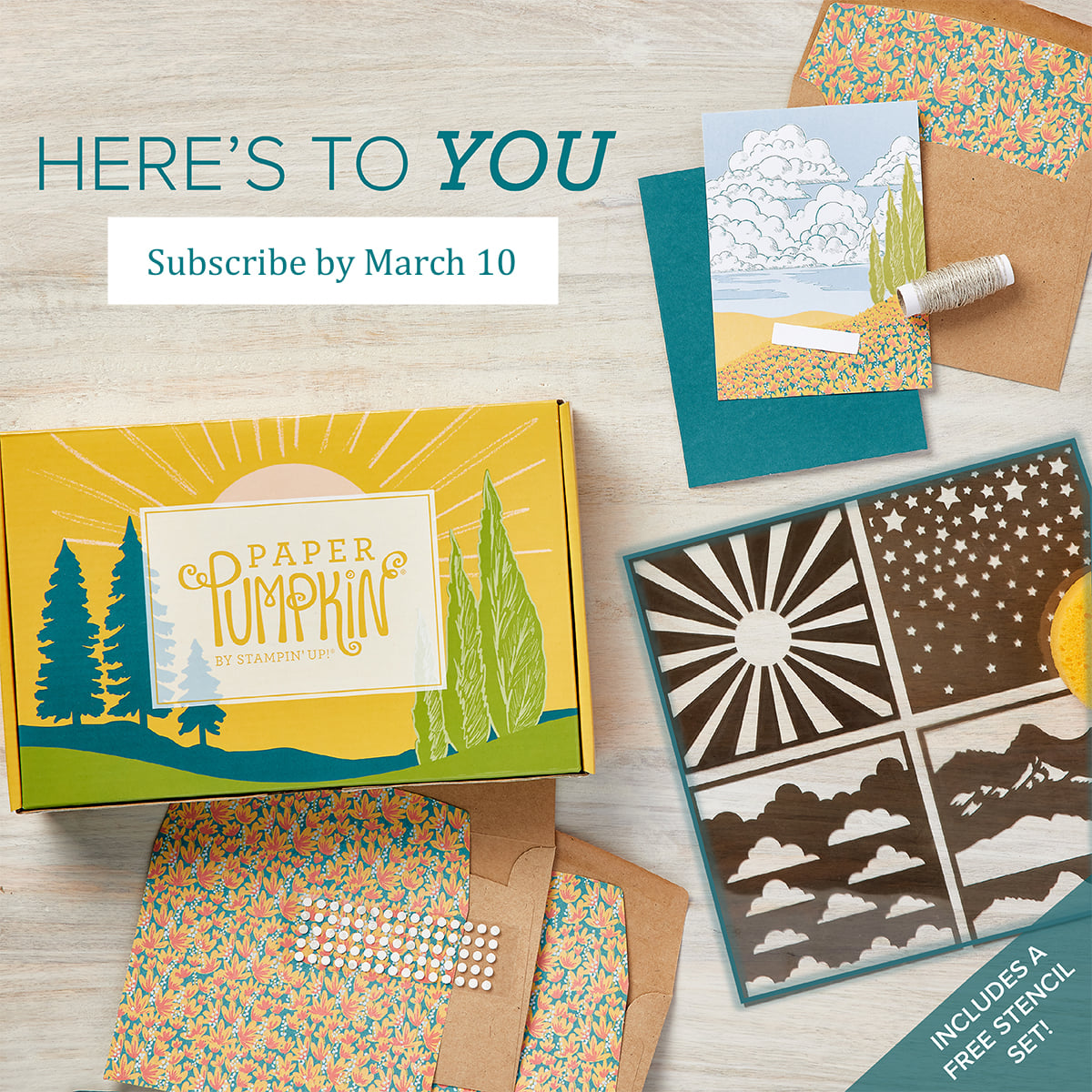 Subscribe at Paper Pumpkin to get your “Here’s to You” kit today! Let me know if you have any questions, I just made sure my account was up to date yesterday!! Can’t wait for this one 🙂