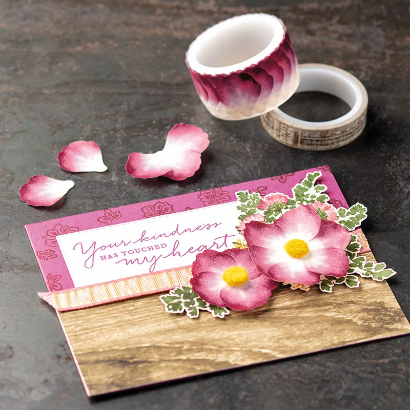 This pretty card is simple to create by just stamping your Pear Pizzaz ink onto Pear Pizzaz cardstock (the technique we used earlier on our “To a Wild Rose” bundle. Then with the dies, you can add some delicate embellishments behind your banner to really draw the eye to your greeting.
