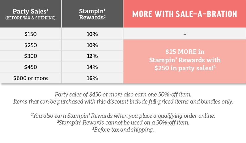 Need another excuse to get together with friends? Just host a qualifying party with at least $250 in sales during Sale-A-Bration and you’ll earn $25 more in Stampin’ Rewards! You can even apply your Stampin’ Rewards toward a Starter Kit and become a demonstrator yourself!