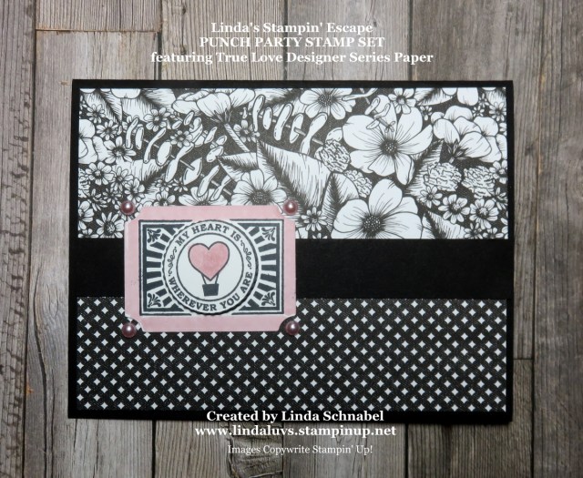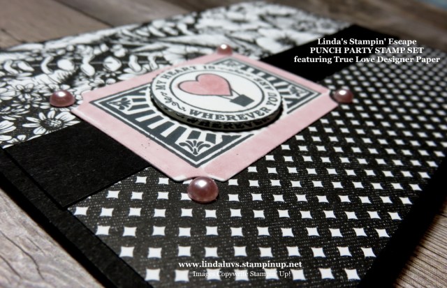 The designer paper here is the TRUE LOVE Designer Paper from the Love You Always Suite found on page 11 of the Jan-June Mini Catalog … each piece is 2″ x 5-1/4″. I added a 3/4″ x 5-1/4″ piece of Basic Black to finish off the edge between the two pieces and to make the greeting “POP” once in place.