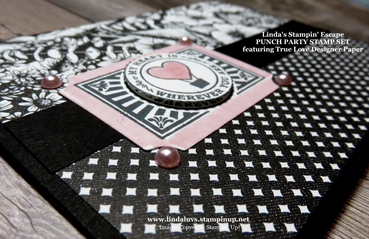 Let me share a fun technique I used for my card … See the “big polka dots” paper just above us? Yep … I punch my hearts from the Designer paper and then stamped my greeting onto it. You can get the Paper Blooms Designer Paper FREE when you make a purchase of $50 from either the Annual or Mini Catalogs.