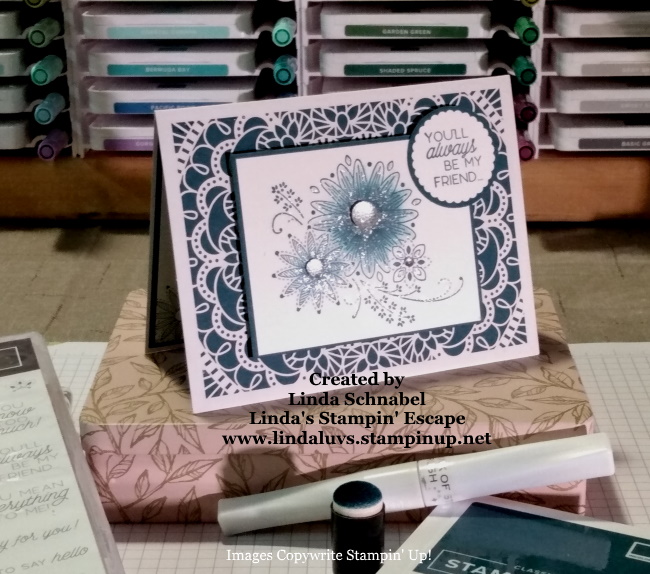 Hope you are enjoying this beautiful weather we’re having. With windows open and sun shining in, I created a simple but elegant card using the “A Little Lace” bundle. Today’s card is Monochromatic … I’m using the the beautiful “gem tone” Pretty Peacock color.