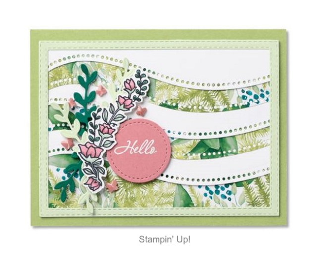 I think it’s time to take it up a notch!! I love this stunning card done with the Fine Art Floral Designer paper (Retiring: June 30th) and Pretty Peacock cardstock (Sold Out). Did you notice that both “curved” dies are used to create a beautiful flow of the card …