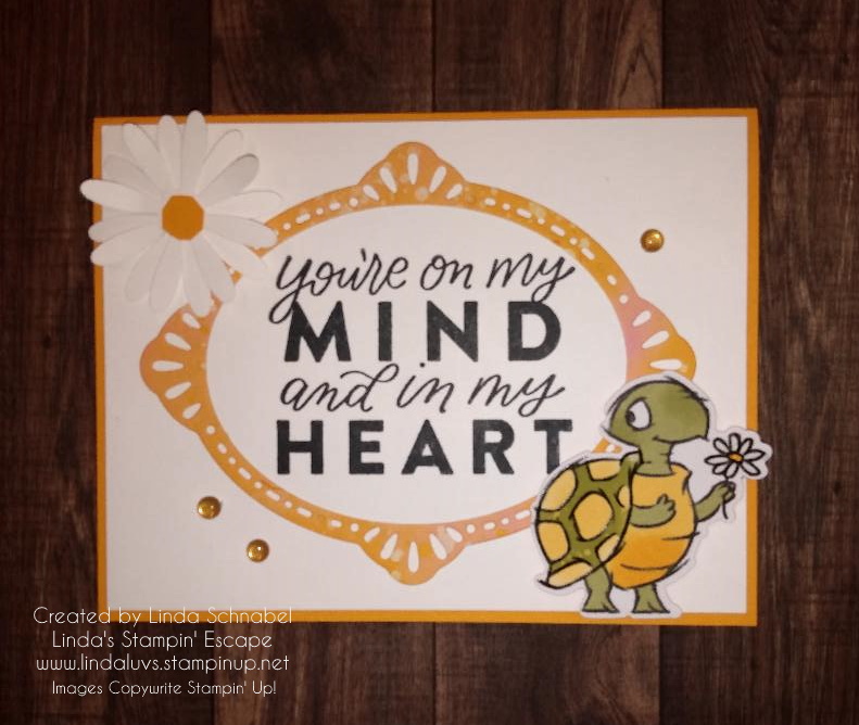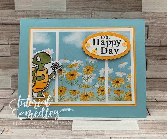 The card measures 3″ x 4″ and I added a Old Olive mat measuring 3-1/8″ x 4-1/8″. The card and mat have popped up with the Stampin’ Dimensionals. The turtle and the bunny were die cut from the Rain or Shine Specialty Designer paper. To complete the card I added the Opaque Adhesive-Backed Gems. The layout I used today is similar to yesterday’s layout, just a few changes can change the entire look of the card.
