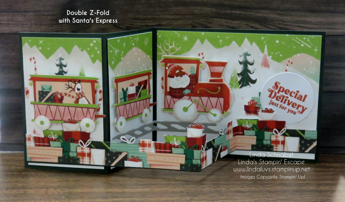 I stamped my greeting Poppy Parade and die cut it and tucked it behind my “Z”. Looks like Santa has some fun coming down those tracks … even his reindeer is along for the ride!! The Santa Express Designer Paper is sooo fun to create with. It’s ON SALE for Only $7.20!! Don’t wait to get yours, it will be gone. Grab it now while we have FREE SHIPPING … Today Only.