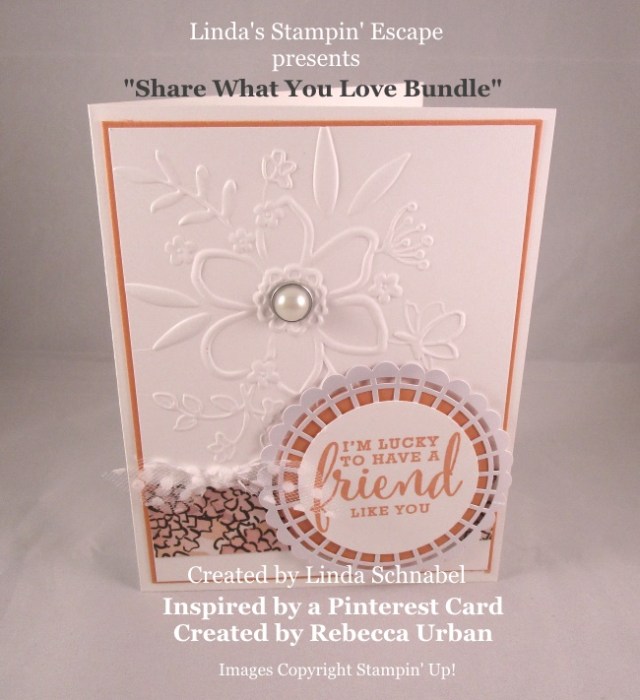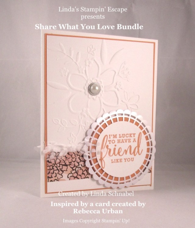 I decided to use the new Grapefruit Grove for my pop of color. I cased Rebecca’s the layout only changing the placement of the mat on the doily … mine is placed behind the doily, whereas Rebecca had her color on the front, directly behind the greeting. Both of us used the “Share What You Love” Designer paper … just different patterns.