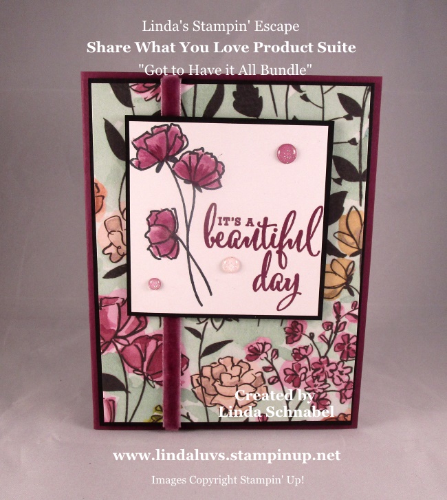 This card shows another one of the Designer papers … this one has the shimmer or Pearlized look on the flowers. It also shows the 3rd stamp set that is included in the “Got to Have It All” bundle. You can’t see it well on this photo but I added Wink of Stella on the flowers!!