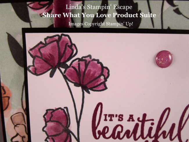 I used one of the designer papers from the Share What You Love … Got to Have it All bundle. It is so pretty! We then stamped our greeting and the flowers to wrap around the greeting.