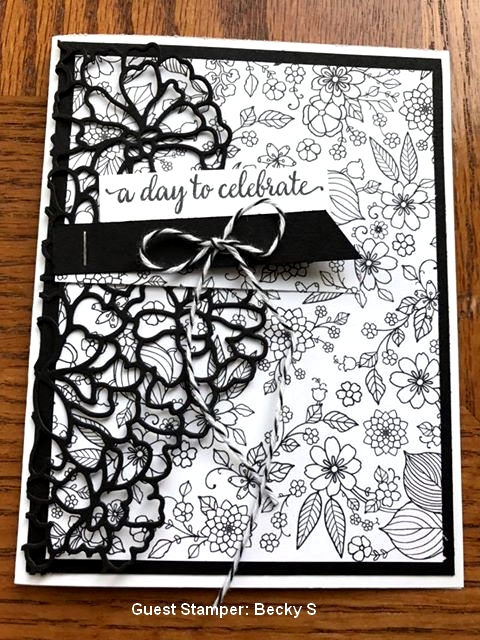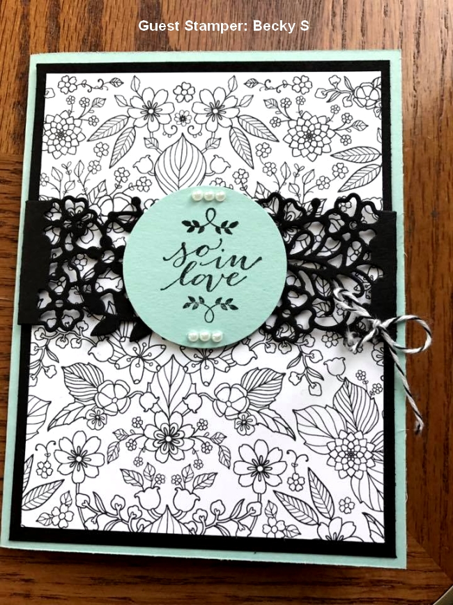On the last of the three cards, Becky introduces color to her card … the splash of color really makes the card pop, even though they are lovely in Black and White as well.