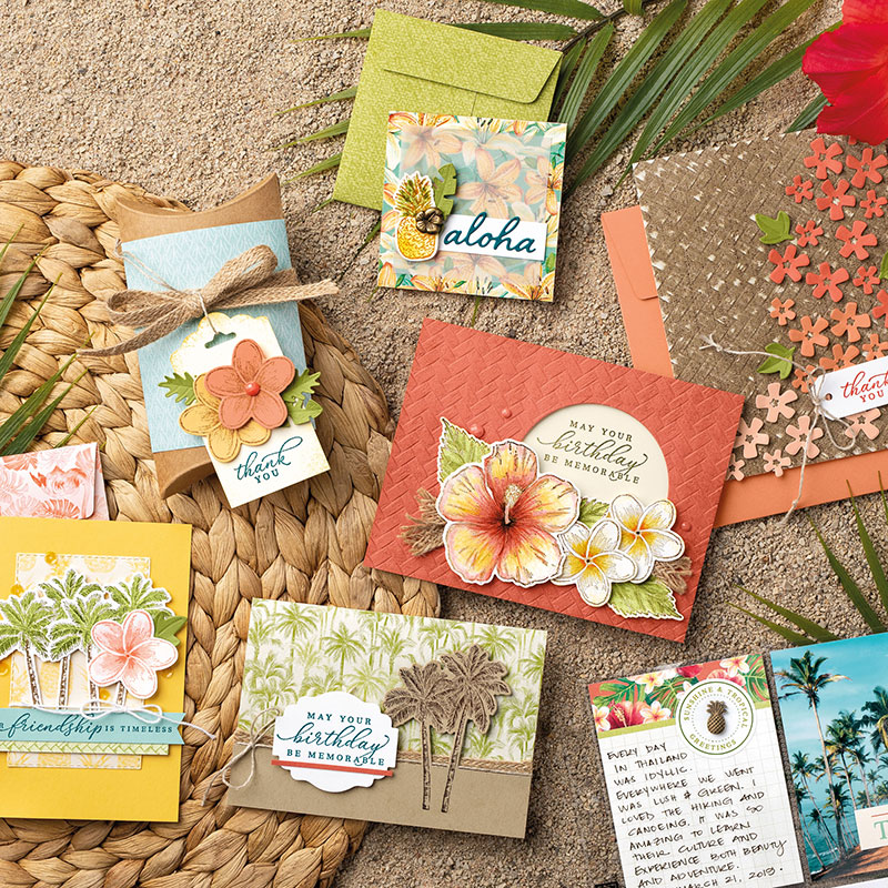 The Tropical Oasis Designer Series Paper includes retro tropical images including palm trees, flowers, fruit, flamingos, and vintage surf woody wagons…. and makes me want to head to Hawaii. We maybe practicing “Social Distancing” so I’m traveling through my card designs!!