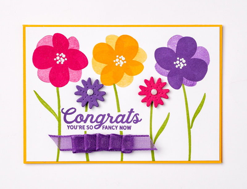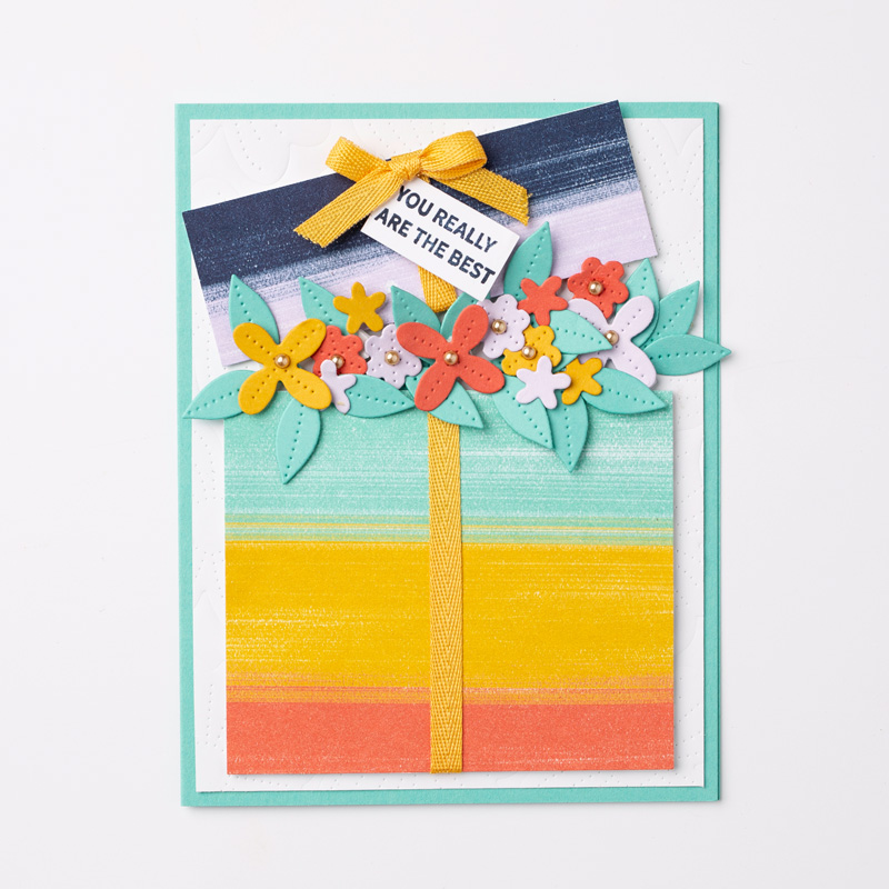The second card is all about color and repetition! This simple repeat stamping technique creates a fun, custom background. Choose a sentiment from the Sweetly Scripted stamp set and stamp it multiple times in different ink colors across your cardstock. Using bright, coordinating colors makes the design pop! Add a focal point or embellishments to complete the card. This technique is a great way to get more use out of your sentiment stamps while making a unique, eye-catching design.