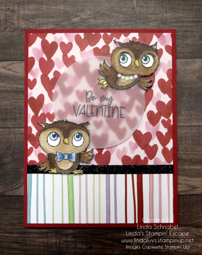 I am tickled pink to share today’s card with you. With Valentines Day approaching quicker than we’d like to think and I cannot get enough of these little owls from the Adorable Owls so they are highlighting my card again today. The Adorable Owls will be FREE during Sale-a-bration with a qualifying order.