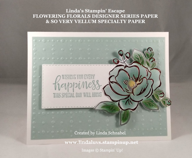 Did you notice the addition to the vellum? It’s the Layering Designs Vellum and can be found in the Annual Catalog. I think it really adds to the card … especially if you are sending this card “across the miles”!!