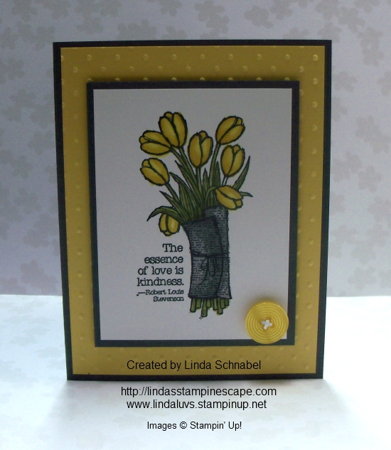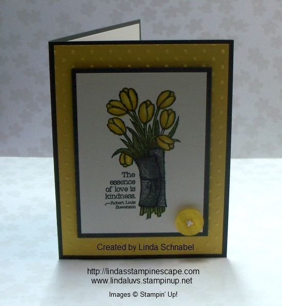 On that note, I can’t wait to share today’s card with you. First time on my blog … the “Love is Kindness” stamp set. And what says spring better than tulips!! I stamped the image with the Momento ink pad and chose the “Daffodil Delight” Blendabilities to color them.