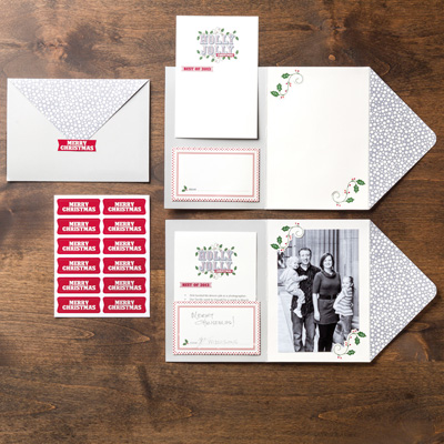 Create oodles of cards quickly and easily with the Holly Jolly Greetings Simply Sent kit. Materials for 12 holiday photo cards: printed cards with die-cut photo notches, note card for handwritten or printed message, closure stickers. Finished card size: 5″ x 7″. Acid free, lignin free.