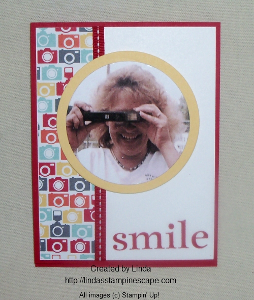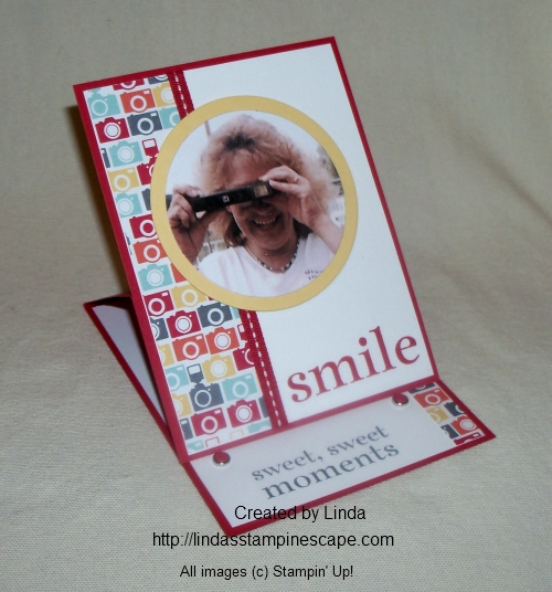 I began with Very Vanilla cardstock, and the “Birthday Basics” Designer Series Paper. I thought this pattern was cute for a simple style of card.