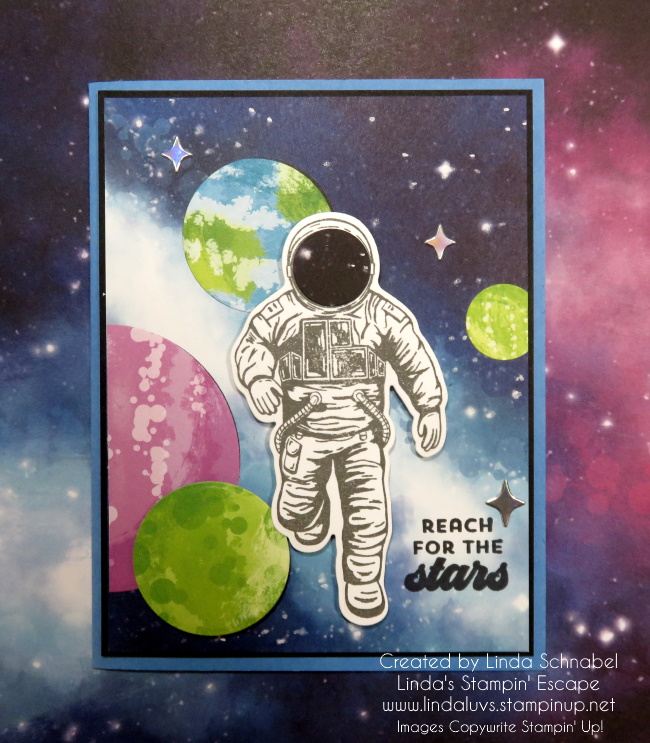 I used a 4″ x 5-1/4″ sheet of Basic White to stamp both the Astronaut and the Space Shuttle (as I call them) I mentioned in the video that I stamped several at a time, and then die cut them all. I did the same for the planets on both card #1 and card #2. It’s so much easier to just keep making cards when the basics are all ready for you!