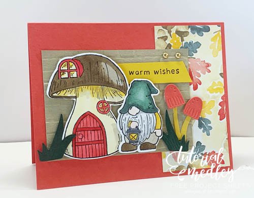 He’s so cute … isn’t he? I liked the layout so that is the card I chose. I decided to swap out the Happier than Happy Bundle for the Kindest Gnomes bundle. I couldn’t resist the pretty Storybook Gnomes Designer paper that would be the backdrop for my cute little gnome.