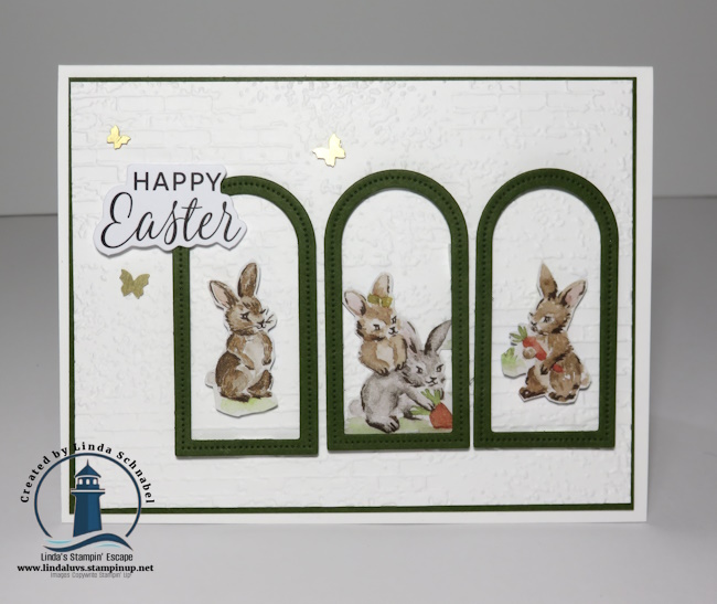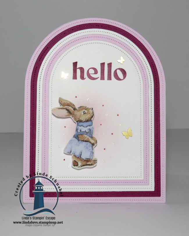 I love the way these sweet bunnies (cut from designer paper) are playing within the arches … it’s a fun way to highlight the arches dies. This card would make a cute spring, birthday or thinking of you card as well.