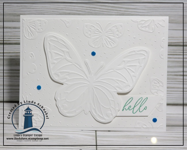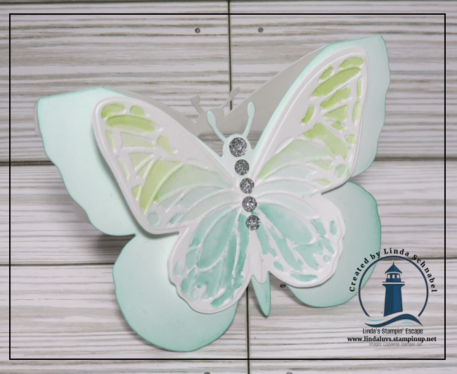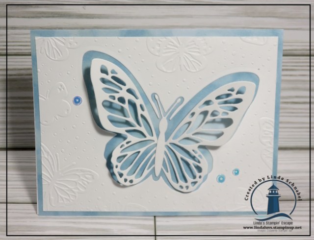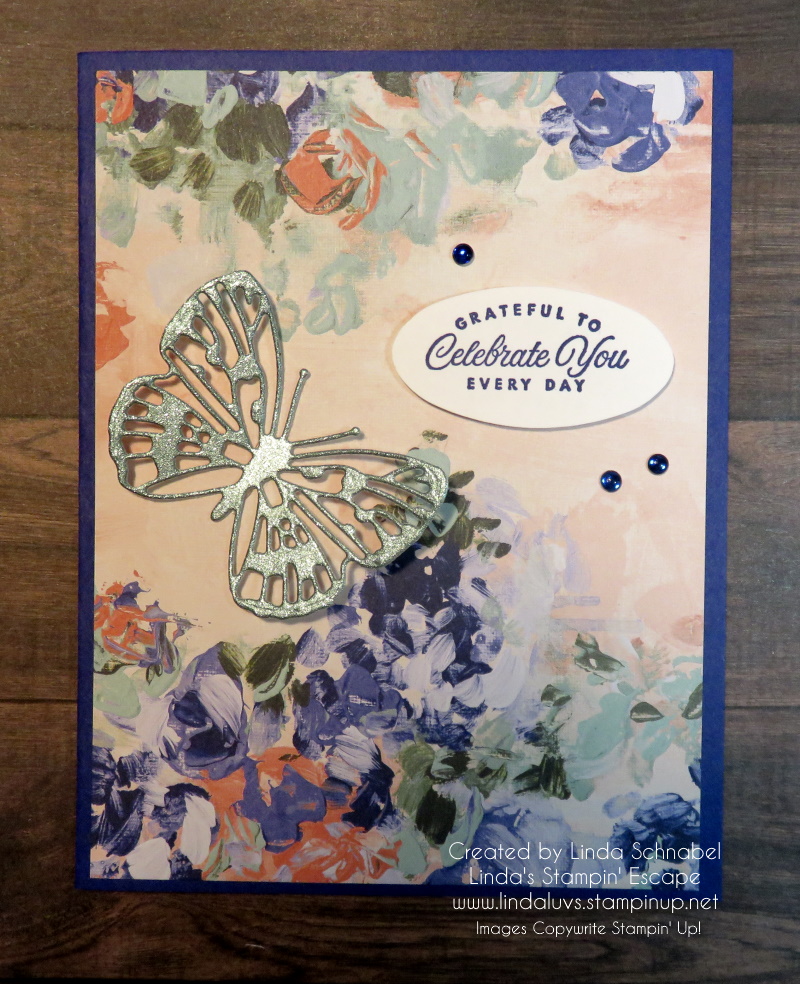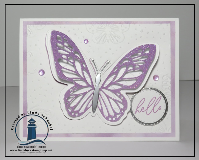This card uses the Bokeh designer paper as a mat (and peeks through under the butterfly), the folder with the die, the die to cut the detailed butterfly out of the Ombre Glitter paper, and the embellishments to complete the card.