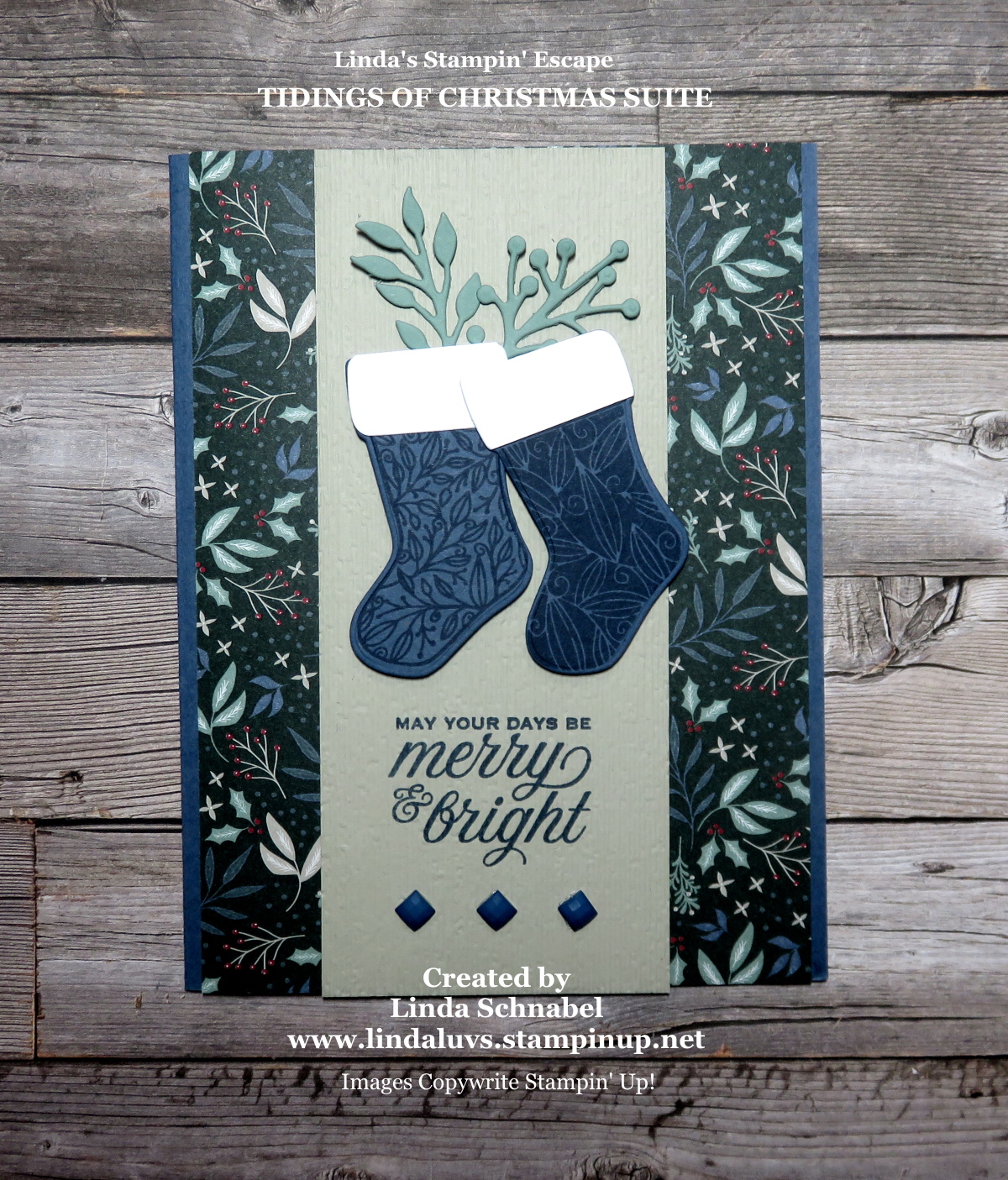 Let the weekend officially begin … How did you enjoy the Tidings of Christmas card that I shared yesterday? Yes? Well … I have another for card for you using this suite and where I’m going to showcase the dies from the suite; the stockings and some greenery …