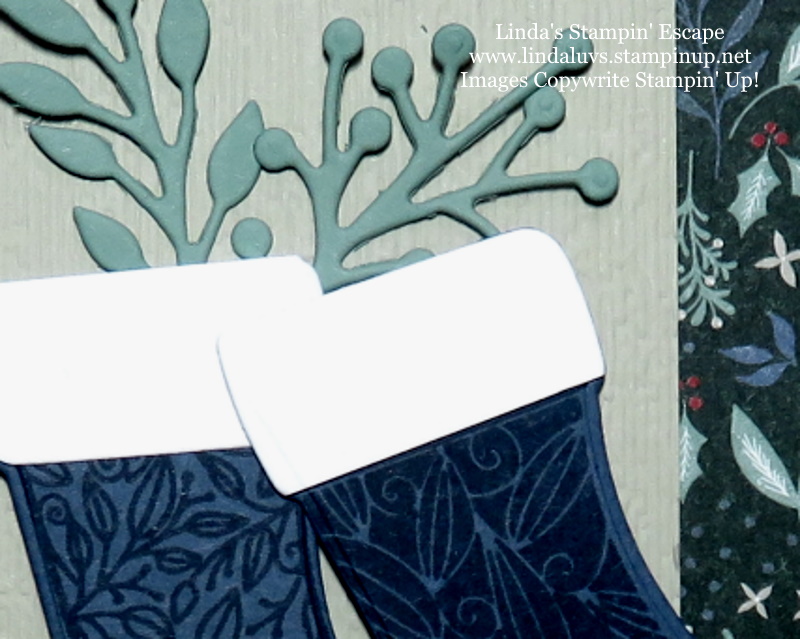 I stamped the greeting in Misty Moonlight on the Sahara Sand. Then I stamped the stockings in the Misty Moonlight on Misty Moonlight then die cut them The white tops were cut using the top of the stocking die as there is “no” separate die for that.