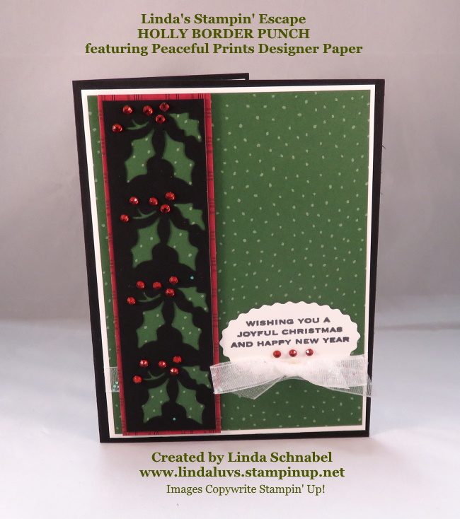 Yesterday I shared a “simply” beautiful card using the Peaceful Prints Designer paper, and today I have another with this paper but highlighting the NEW Holly Border Punch. It was something on my Wish List so today I wanted to share this card with you… these two holiday treats paired perfectly together.