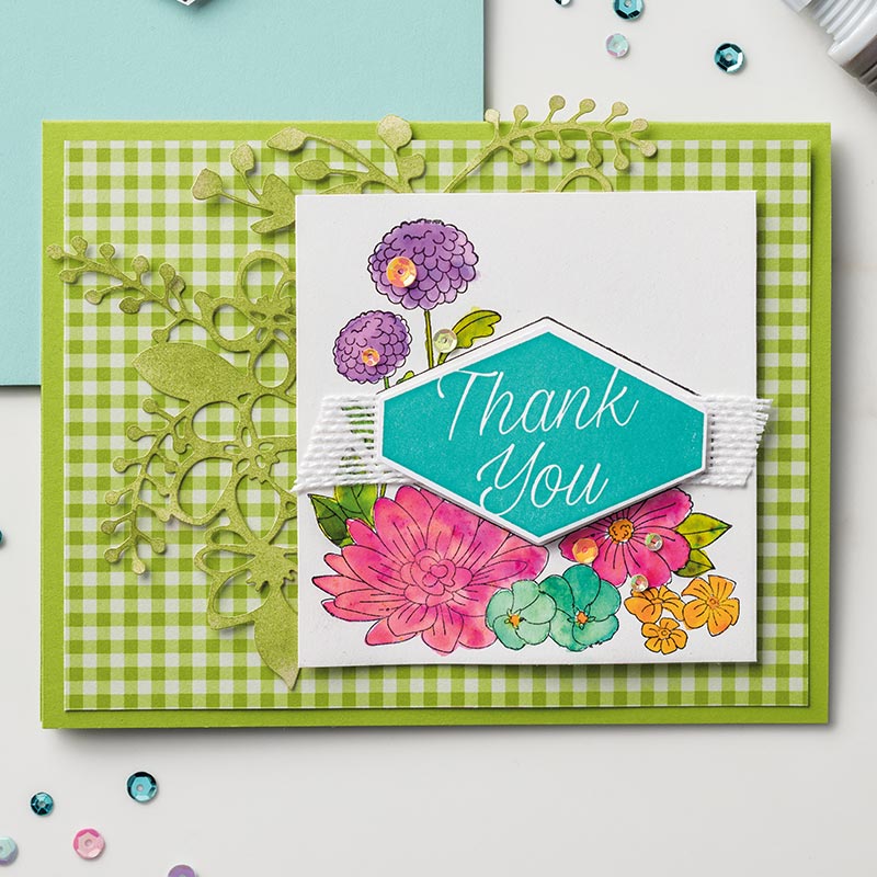 The card uses watercoloring to add color to the flowers, and the greeting images is stamped and punched out with the coordinating Tailored Tag punch. The punched greeting and die cut florals behind the stamped image adds so much dimension and texture to the card.