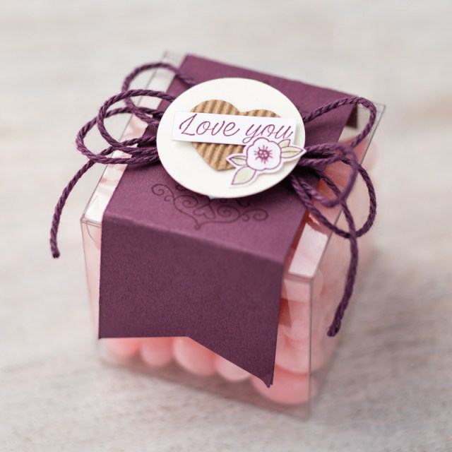 The precious little gift used the Clear Tiny treat boxes (pg.173) and a simple banner folded over the treat box. The banner is stamped with the element images included in the Accented Blooms stamp set. And our greeting … well, that was created by using just a part of the stamped greeting. Sometimes we forget how a simple little stampin’ tip like this can help transform your projects.