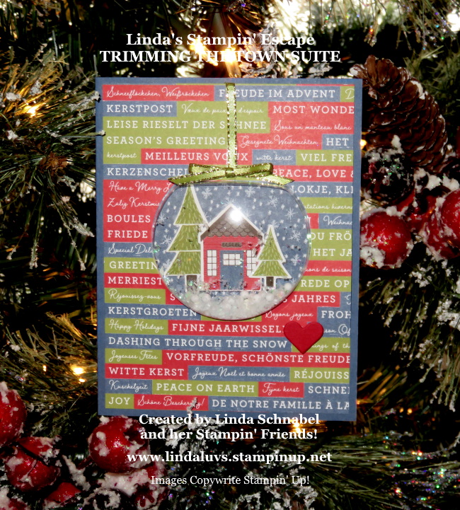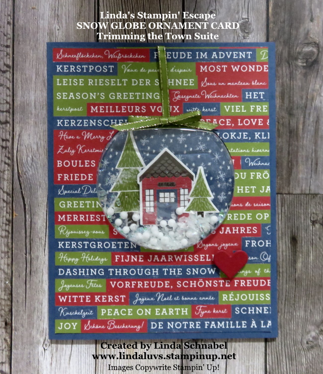 I used the designer paper with the multi-language greetings again to highlight my Snow Globe Ornament. This was actually very easy to create and makes for a FUN card for the recipient!!