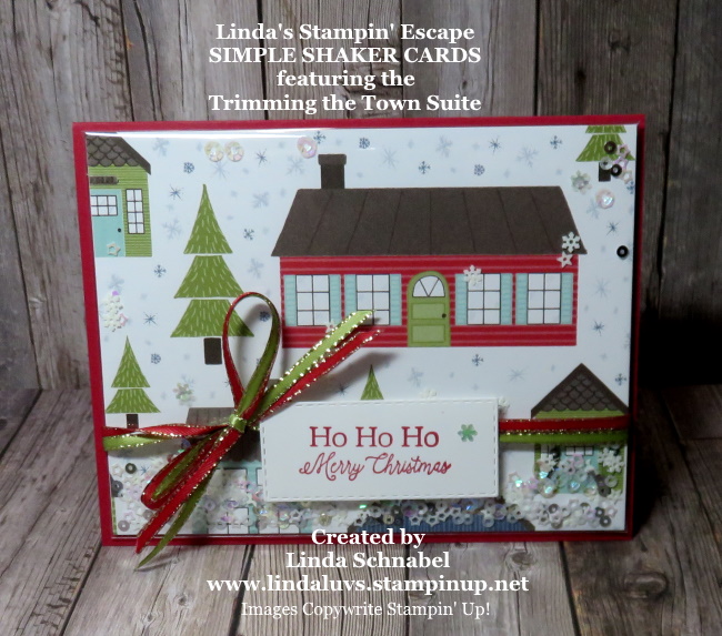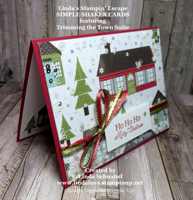 Isn’t that a cool idea … using clear envelopes to create shaker cards. So quick and easy!! I had so much fun making the cards. You begin with your 8-1/2″ x 5-1/2″ card base scored at 4-1/4″ … fold in half. Your designer paper will be cut 4″ x 5-1/4″ – you could put some cardstock behind it if your want it a little sturdier for tying bows.