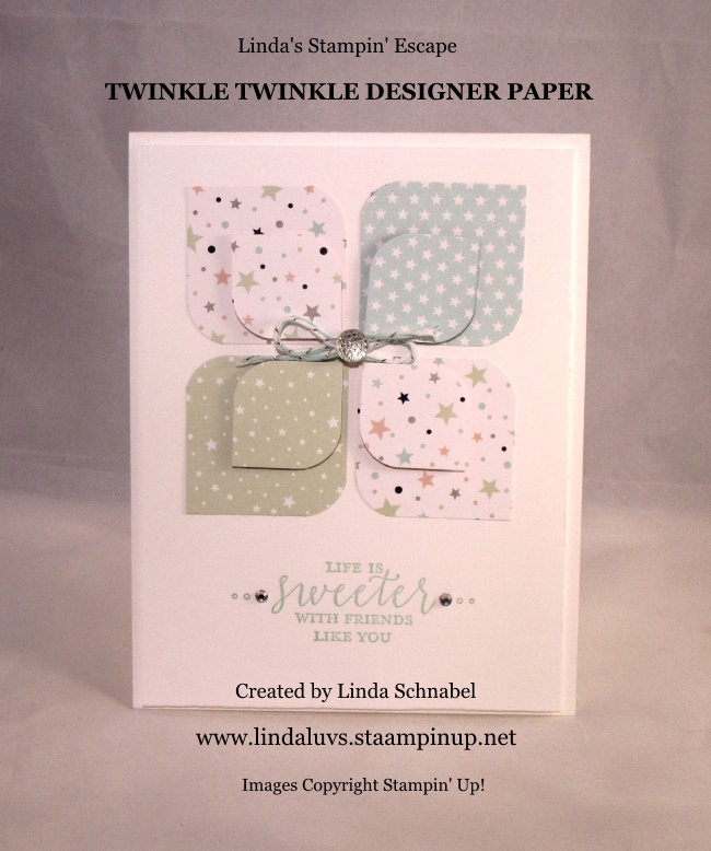 Our gift box is so pretty and it is so easy to recreate … the pretty snowflakes from the stamp set are actually stamped on a pattern of designer paper found in the Twinkle Twinkle Designer paper (not just for baby cards either).