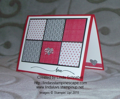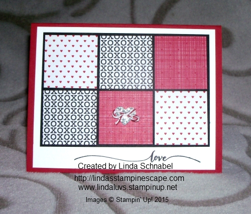 The third card adds a bit more “bold” to our valentine cards … I pulled the red out of the designer paper pattern and added some black. Don’t you just love the gingham ribbon, so glad it carried over, it adds that nice pop without over taking the the hearts.