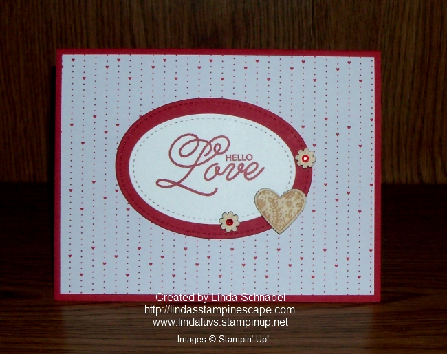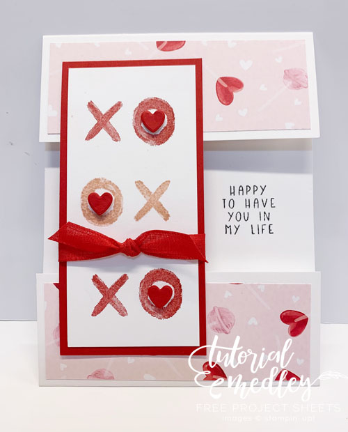 A simple card base and a 3″ x 3″ square with a 3-1/4″ x 3-1/4″ mat with a coordinating color behind it. Stamp on your greeting and your good to go. Remember, you can stamp those cute hearts instead of die cutting your designer paper … just do what works best for you!