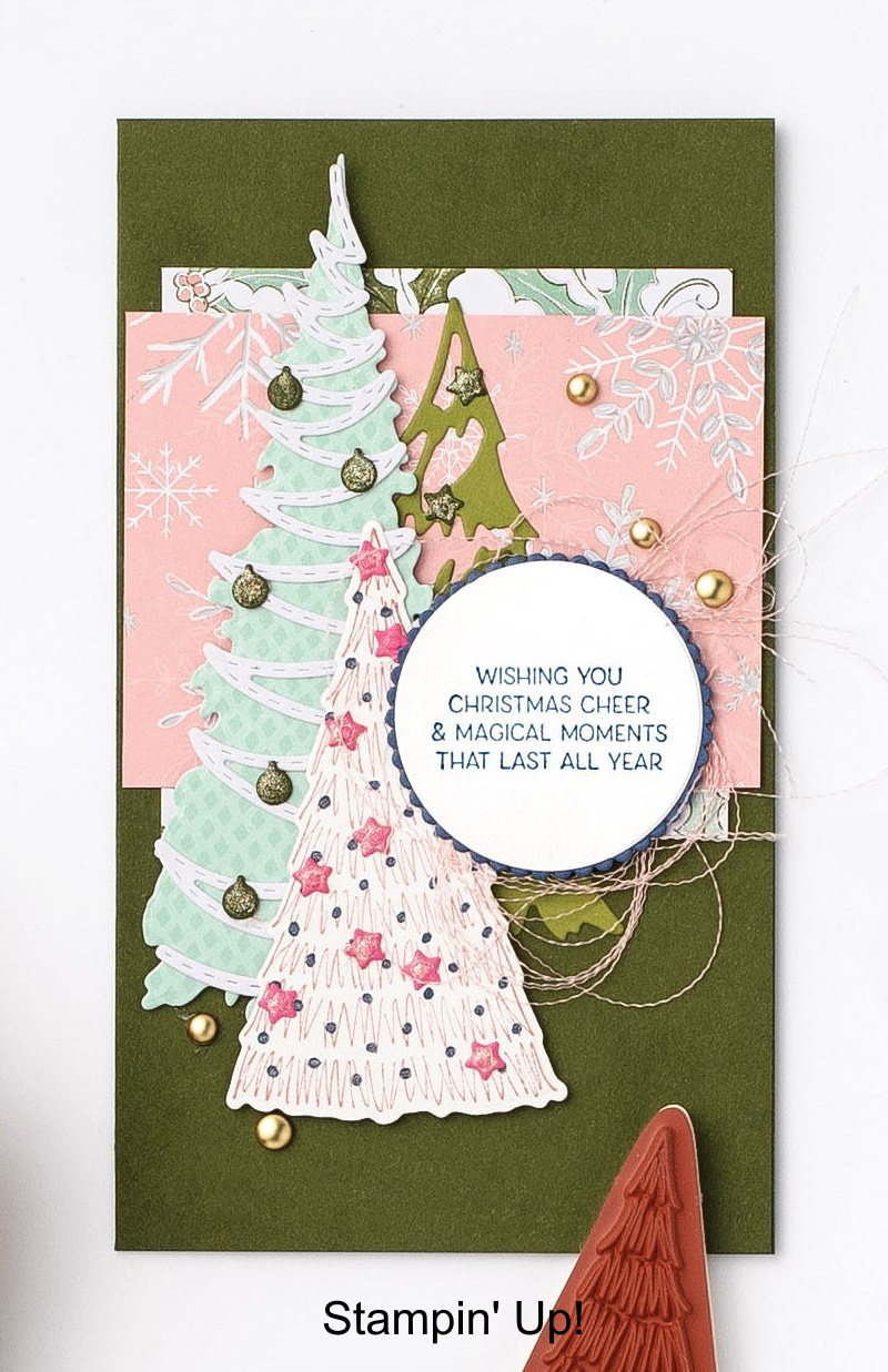 6) Die cut the stamped tree with coordinating die, Old Olive with the open tree die, and Mint Macaron diamond patterned Whimsy & Wonder Specialty Design Series Paper with the tallest tree die.